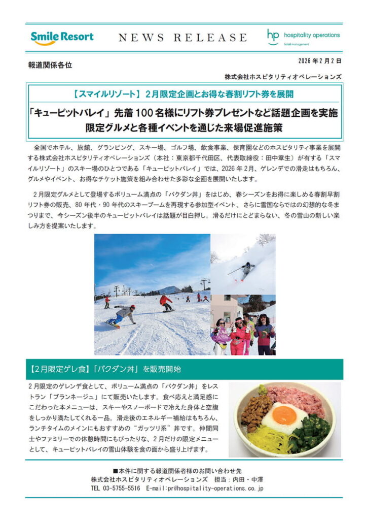 全国でホテル、旅館、グランピング、スキー場、ゴルフ場、飲食事業、保育園などのホスピタリティ事業を展開する株式会社ホスピタリティオペレーションズ(本社:東京都千代田区、代表取締役:田中章生)が有する「スマイルリゾート」のスキー場のひとつである「キューピットバレイ」では、2026年2月、ゲレンデでの滑走はもちろん、グルメやイベント、お得なチケット施策を組み合わせた多彩な企画を展開いたします。