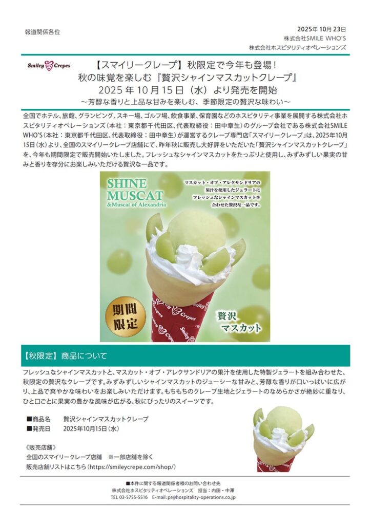 全国でホテル、旅館、グランピング、スキー場、ゴルフ場、飲食事業、保育園などのホスピタリティ事業を展開する株式会社ホスピタリティオペレーションズ(本社:東京都千代田区、代表取締役:田中章生)のグループ会社である株式会社SMILE WHO’S(本社:東京都千代田区、代表取締役:田中章生)が運営するクレープ専門店「スマイリークレープ」は、2025年10月15日(水)より、全国のスマイリークレープ店舗にて、昨年秋に販売し大好評をいただいた「贅沢シャインマスカットクレープ」を、今年も期間限定で販売開始いたしました。フレッシュなシャインマスカットをたっぷりと使用し、みずみずしい果実の甘みと香りを存分にお楽しみいただける贅沢な一品です。
