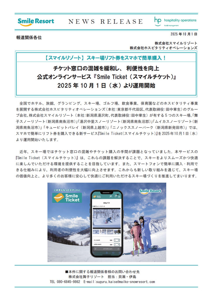 全国でホテル、旅館、グランピング、スキー場、ゴルフ場、飲食事業、保育園などのホスピタリティ事業を展開する株式会社ホスピタリティオペレーションズ(本社:東京都千代田区、代表取締役:田中章生)のグループ会社、株式会社スマイルリゾート(本社:新潟県湯沢町、代表取締役:田中章生)が有する5つのスキー場、「舞子スノーリゾート(新潟県南魚沼市)」「湯沢中里スノーリゾート(新潟県南魚沼郡)」「ムイカスノーリゾート(新潟県南魚沼市)」「キューピットバレイ(新潟県上越市)」「ニノックススノーパーク(新潟県新発田市)」では、スマホで簡単にリフト券を購入できる新サービス『Smile Ticket(スマイルチケット)』を2025年10月1日(水)より運用開始いたします。