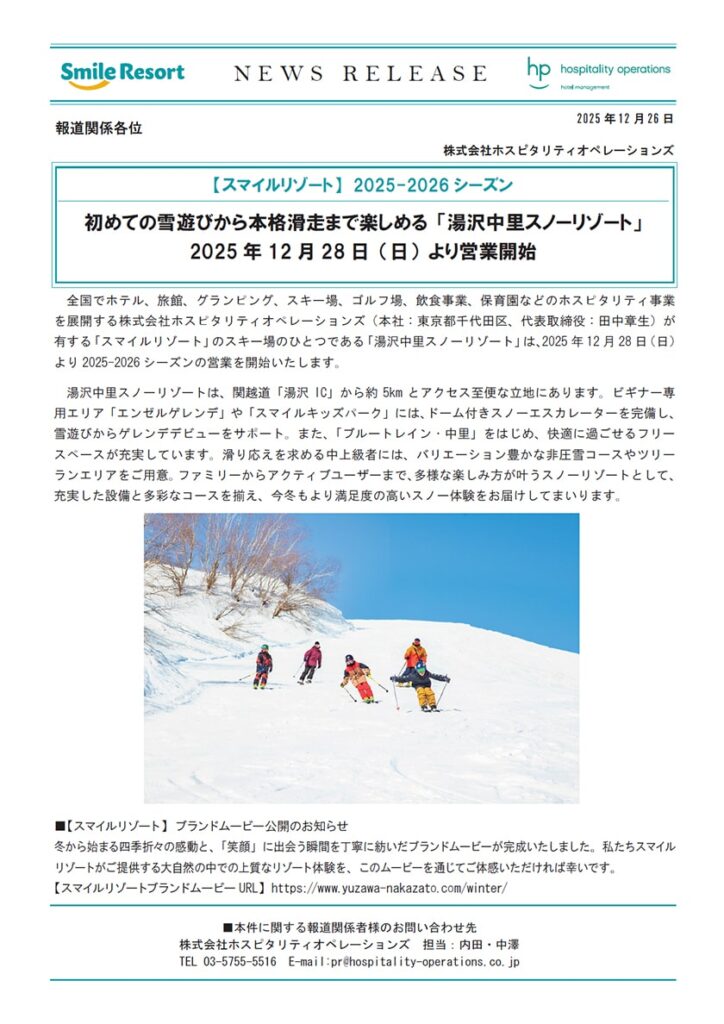 全国でホテル、旅館、グランピング、スキー場、ゴルフ場、飲食事業、保育園などのホスピタリティ事業を展開する株式会社ホスピタリティオペレーションズ(本社:東京都千代田区、代表取締役:田中章生)が有する「スマイルリゾート」のスキー場のひとつである「湯沢中里スノーリゾート」は、2025年12月28日(日)より2025-2026シーズンの営業を開始いたします。