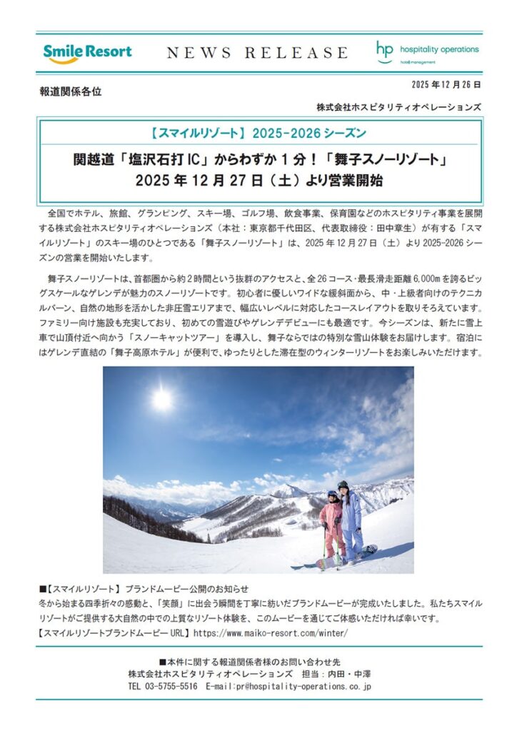 全国でホテル、旅館、グランピング、スキー場、ゴルフ場、飲食事業、保育園などのホスピタリティ事業を展開する株式会社ホスピタリティオペレーションズ(本社:東京都千代田区、代表取締役:田中章生)が有する「スマイルリゾート」のスキー場のひとつである「舞子スノーリゾート」は、2025年12月27日(土)より2025-2026シーズンの営業を開始いたします。