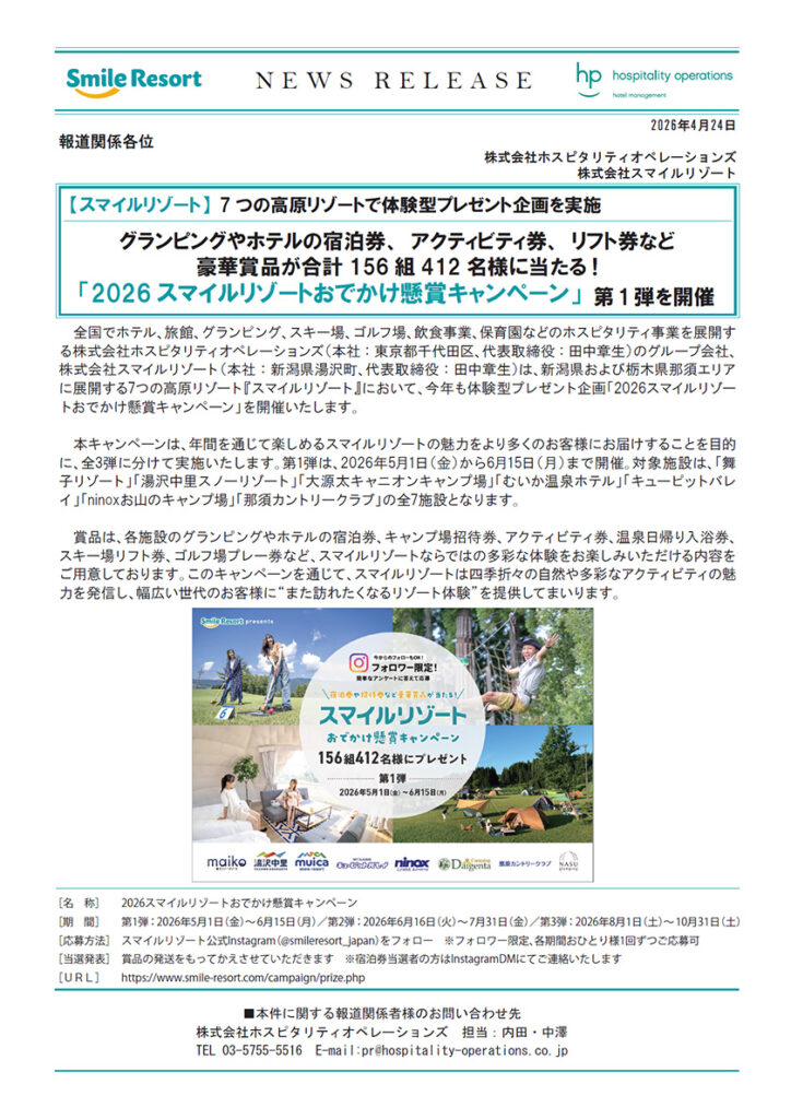 全国でホテル、旅館、グランピング、スキー場、ゴルフ場、飲食事業、保育園などのホスピタリティ事業を展開する株式会社ホスピタリティオペレーションズ(本社:東京都千代田区、代表取締役:田中章生)のグループ会社、株式会社スマイルリゾート(本社:新潟県湯沢町、代表取締役:田中章生)は、新潟県内に6施設、栃木県那須に1施設を構える高原リゾート「スマイルリゾート」において、今年も体験型プレゼント企画「2026スマイルリゾートおでかけ懸賞キャンペーン」を開催いたします。
