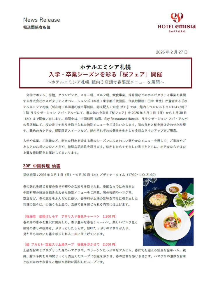 『ホテルエミシア札幌(所在地:北海道札幌市厚別区、総支配人:知念 浩)』では、館内3つのレストランおよび地下1階リラクゼーション スパ・アルパにて、春の訪れを彩る「桜フェア」を2026年3月1日(日)から4月30日(木)まで開催いたします。旬の食材と桜を掛け合わせた料理や、春色のカクテル、期間限定スイーツなど、館内それぞれの個性を生かした多彩なラインアップをご用意。入学や卒業、ご就職など、新たな門出を迎える春のシーズンにふさわしい華やかなメニューを通して、ご家族やご友人とのお祝いのひとときや、特別な記念日を彩ります。