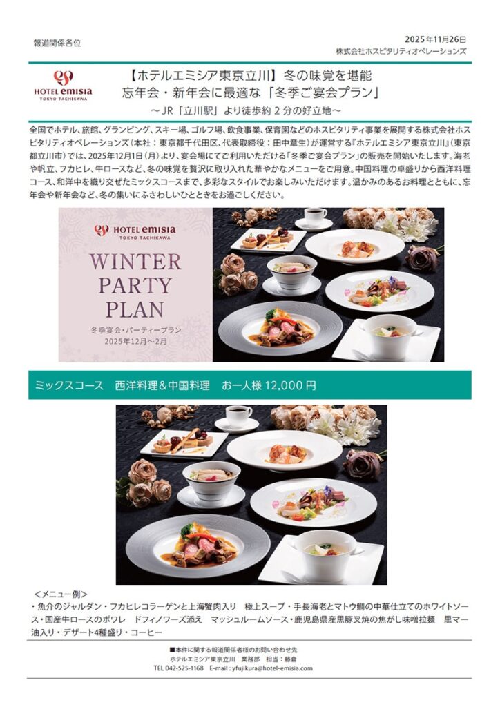 『ホテルエミシア東京立川』(東京都立川市)では、2025年12月1日(月)より、宴会場にてご利用いただける「冬季ご宴会プラン」の販売を開始いたします。海老や帆立、フカヒレ、牛ロースなど、冬の味覚を贅沢に取り入れた華やかなメニューをご用意。中国料理の卓盛りから西洋料理コース、和洋中を織り交ぜたミックスコースまで、多彩なスタイルでお楽しみいただけます。温かみのあるお料理とともに、忘年会や新年会など、冬の集いにふさわしいひとときをお過ごしください。