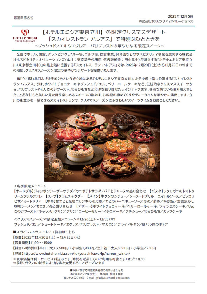 『ホテルエミシア東京立川』(東京都立川市)の最上階に位置する「スカイレストラン ハレアス」では、2025年12月20日(土)から12月25日(木)までの期間、クリスマスシーズン限定の華やかなデザートを提供いたします。ホワイトチョコケーキやブッシュドノエル、ベリーロールケーキなど、伝統的なクリスマススイーツから、パリブレストやりんごのシブースト、わらびもちなど和洋を織り交ぜたラインナップまで、多彩な味わいを取り揃えました。上品な甘さと美しい見た目が楽しめるスイーツの数々は、お料理の締めくくりやティータイムを華やかに演出します。立川の街並みを一望できるスカイレストランで、クリスマスシーズンにふさわしいスイーツタイムをお過ごしください。