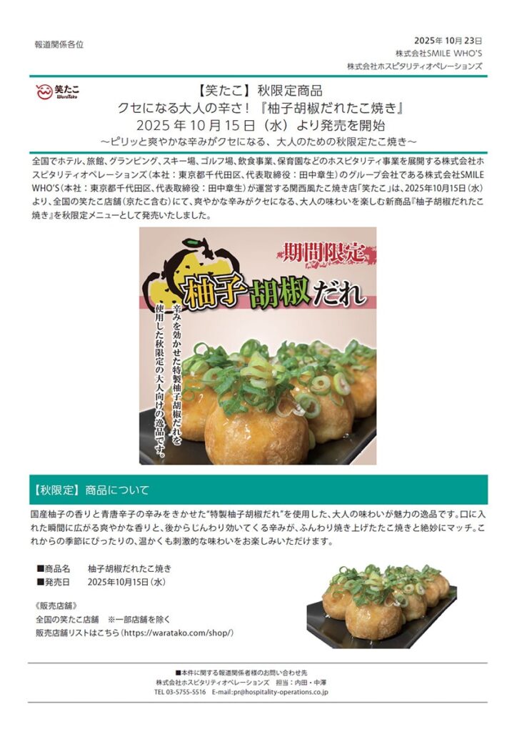 全国でホテル、旅館、グランピング、スキー場、ゴルフ場、飲食事業、保育園などのホスピタリティ事業を展開する株式会社ホスピタリティオペレーションズ(本社:東京都千代田区、代表取締役:田中章生)のグループ会社である株式会社SMILE WHO’S(本社:東京都千代田区、代表取締役:田中章生)が運営する関西風たこ焼き店「笑たこ」は、2025年10月15日(水)より、全国の笑たこ店舗(京たこ含む)にて、爽やかな辛みがクセになる、大人の味わいを楽しむ新商品『柚子胡椒だれたこ焼き』を秋限定メニューとして発売いたしました。