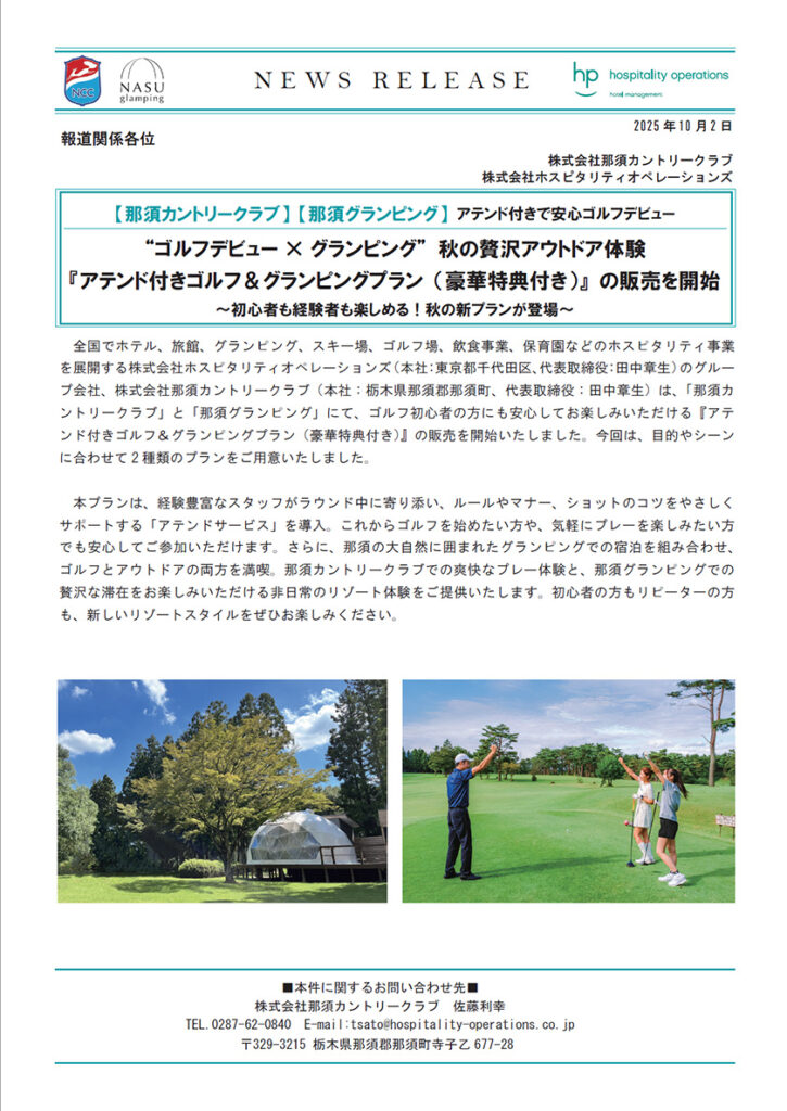 全国でホテル、旅館、グランピング、スキー場、ゴルフ場、飲食事業、保育園などのホスピタリティ事業を展開する株式会社ホスピタリティオペレーションズ(本社:東京都千代田区、代表取締役:田中章生)のグループ会社、株式会社那須カントリークラブ(本社:栃木県那須郡那須町、代表取締役:田中章生)は、「那須カントリークラブ」と「那須グランピング」にて、ゴルフ初心者の方にも安心してお楽しみいただける『アテンド付きゴルフ&グランピング(豪華特典付き)』の販売を開始いたしました。今回は、目的やシーンに合わせて2種類のプランをご用意いたしました。