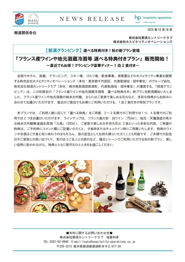 全国でホテル、旅館、グランピング、スキー場、ゴルフ場、飲食事業、保育園などのホスピタリティ事業を展開する株式会社ホスピタリティオペレーションズ(本社:東京都千代田区、代表取締役:田中章生)のグループ会社、株式会社那須カントリークラブ(本社:栃木県那須郡那須町、代表取締役:田中章生)が運営する、「那須グランピング」は、この秋限定の「フランス産ワインや地元酒蔵冷酒等 選べる特典付き」新プランを販売開始いたしました。フランス産ワインや地元酒蔵の純米大吟醸、さらにはご家族で楽しめる花火など、多彩な特典からお好みに合わせてお選びいただけます。直近のご宿泊でもお得にご利用いただける、1 泊2 食付きの特別プランです。