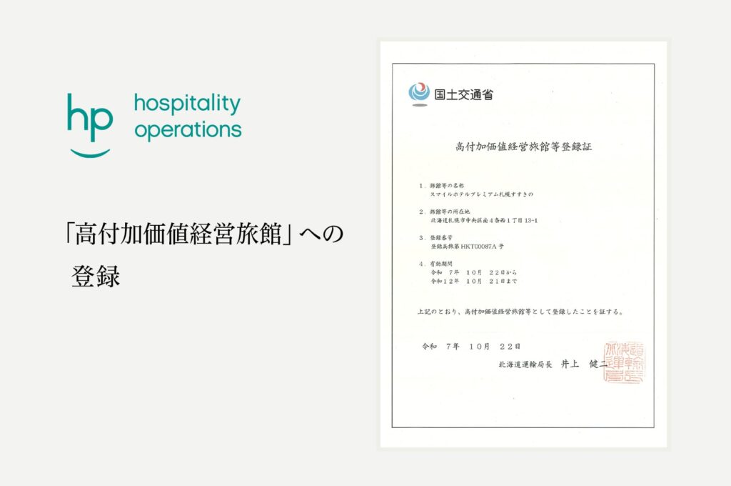 2025年10月、スマイルホテルプレミアム札幌すすきのは「高付加価値経営旅館登録」の登録をいたしました。これは、観光庁が高付加価値のサービスを提供することができるホテルを認定し登録するものであり、経営の透明化やバリアフリー認定などのあらゆるお客さまへの対応、サステナビリティな運営、安全・安心・安眠への配慮などの私たちの取り組みが評価されたものです。